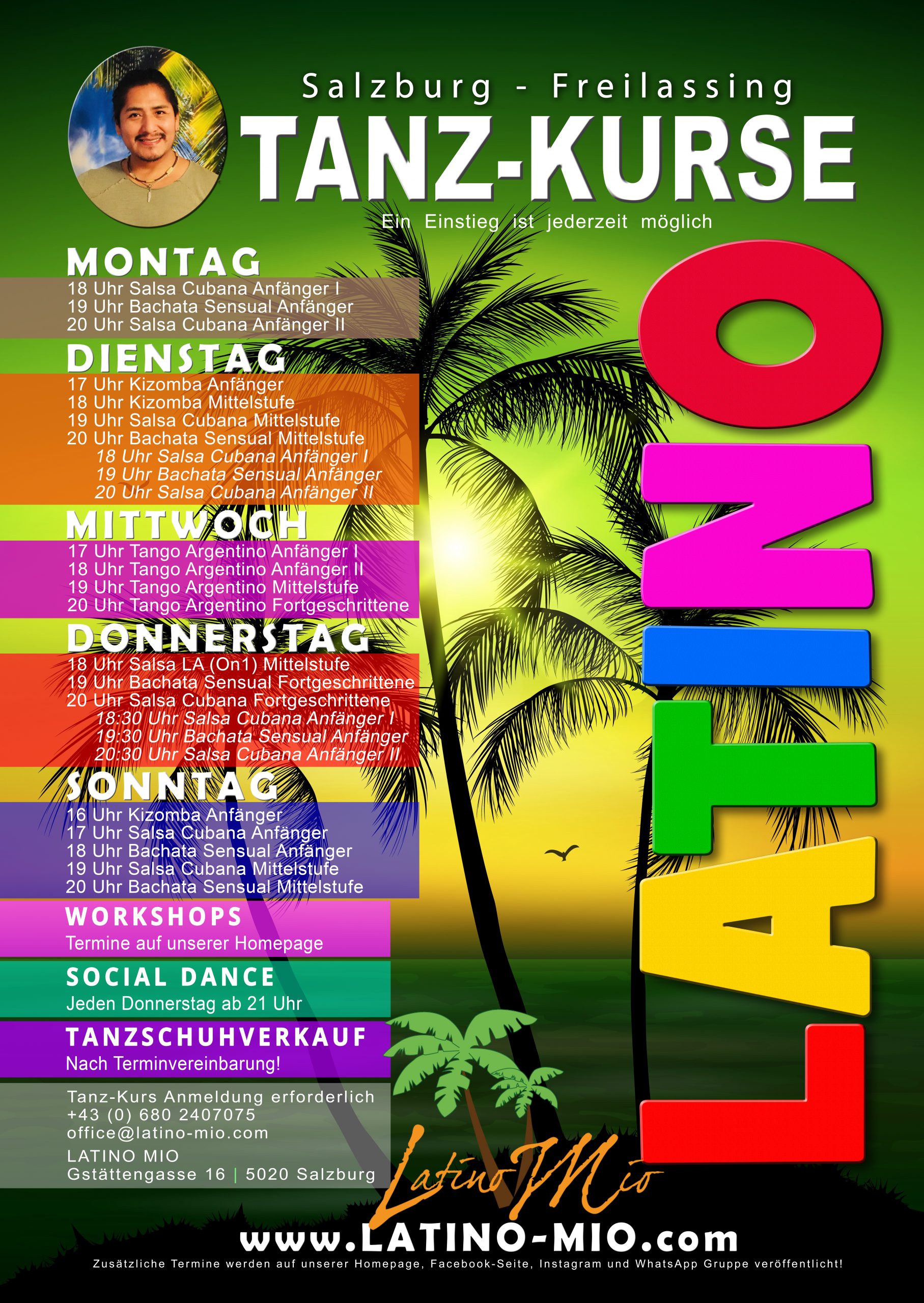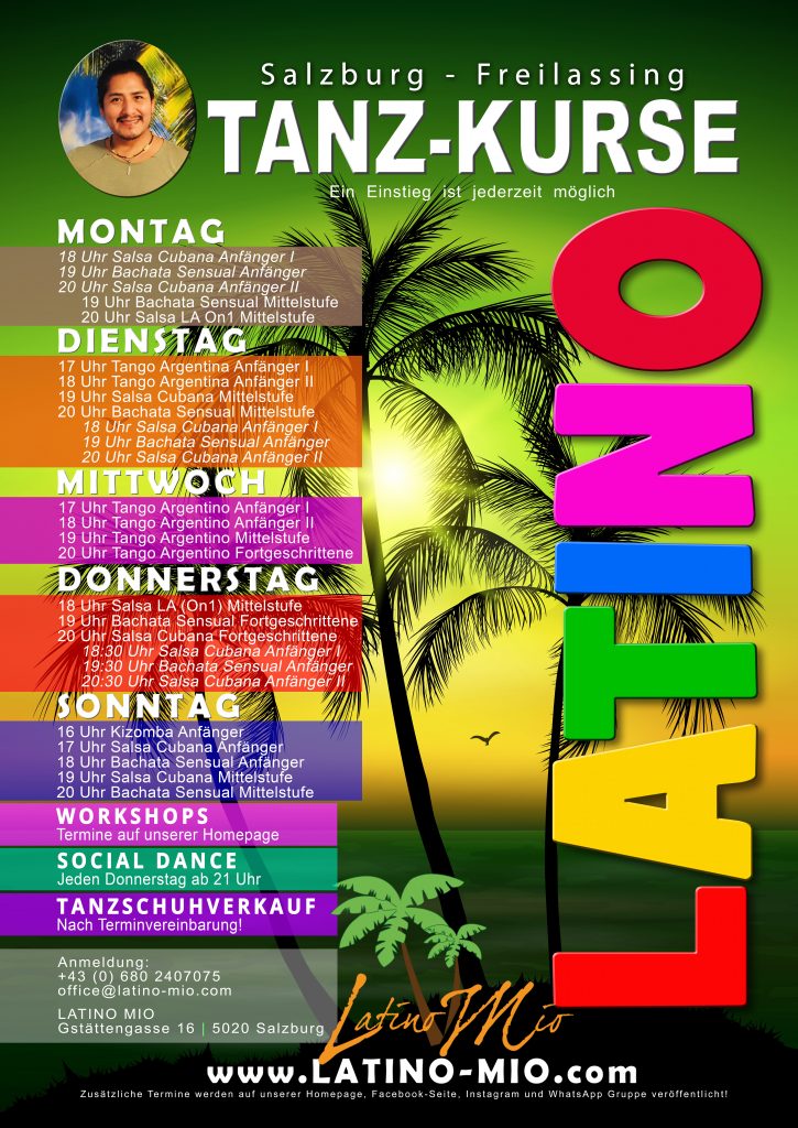 Salsa in Salzburg? Du willst endlich in einem familiären Umfeld Salsa tanzen lernen? Dann bist du hier richtig! Wir sind ein Tanz- und Kulturverein aus Salzburg. Wir bieten Salsa Kurse, Workshops und organisieren Tanzevents. Hauptsächlich bieten wir Tanzkurse für lateinamerikanische Tanzrichtungen an. Tanzen lernen leicht gemacht! Lass dich und deine Freunde vom lateinamerikanischen Temperament verzaubern. Tauche in eine Welt voller heißer Rhythmen und Musik ein, die dich leicht deinen Alltag vergessen lassen!